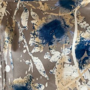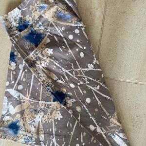 Light tan/gray pencil skirt with white and blue background color. Cotton blend with zipper and hook closure. Great condition with no wear and tear. When laying flat 23” from top to bottom hem.