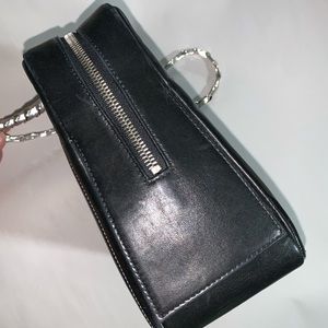 drop dead gorgeous, authentic, CHANEL quilted lambskin leather camera case with zip top closure, flat chainlink/leather strap. Black with contrast top stitch quilting.Iridescent silver-gray fabric lined. 2 sidewall zipper pockets, multiple interior section with lots of extra pouch pockets. EXCELLENT CONDITION, couple small scuffs/scratches at exterior but overall immaculately clean. ONLY ISSUE is leather at chainlink strap is split at one area