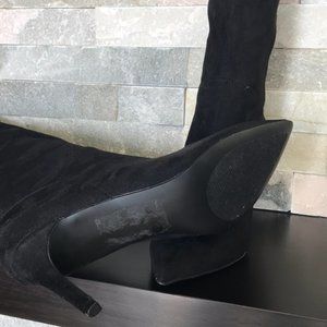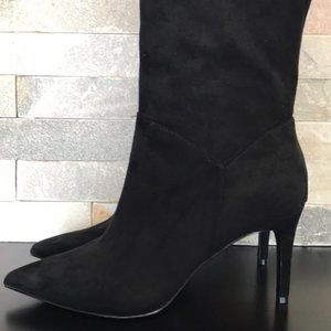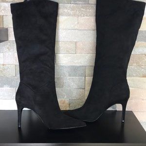New store display may have small stains ,no box see pictures A contour-hugging shaft brings gorgeously curvy counterpoint to the pointy toe and notched piecing of a knee-high boot towering on a tall stiletto. Heel style: stiletto Toe style: pointy toe, closed toe 3.5" heel (size 9.5)true to size 14.5" shaft; 15" calf circumference Pull-on style Synthetic upper, lining and sole