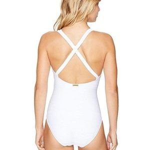Features ribbed Ottoman fabric with plunge neckline and removable cup liners. Super chic textured fabric in white.