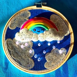 The cutest little rainbow wall art you ever did see! Handmade by Yours, Truly. Hand painted embroidery linen, embellished and treated with a UV protective acrylic varnish, then hand beaded with frosted glass raindrop beads. 6” bamboo embroidery hoop. This piece has a metallic royal blue sky; see my other listings for one that has a robin’s egg blue sky.