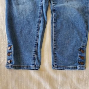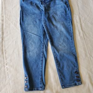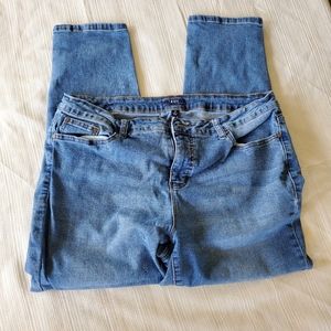 IZOD brand womens jeans. 73% cotton, 20% polyester, 5% rayon, 2% spandex. Machine wash. Size 16. Waist about 17 1/2", rise 10 1/2", inseam 27", opening at the ankle is about 6 1/4"
