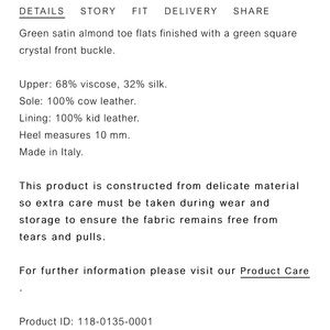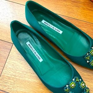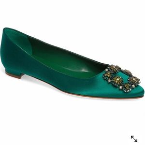 Green satin almond toe flats finished with a green square crystal front buckle. Brand new with tag. 100% authentic. Dust bag only. I could give Hermes shoes box. Size 37.