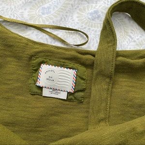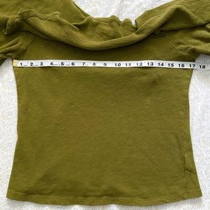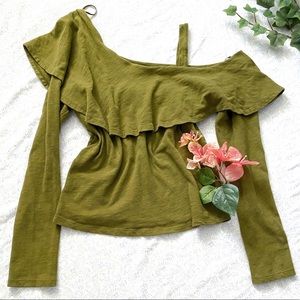 Size woman’s M - may run small, see photos for measurements • 100% cotton - opaque, stretches out, very breathable • In excellent condition, no flaws • A flattering olive green long sleeve top with a single strap cold-shoulder style sleeve on one side. Flowy fabric drapes over the bust.