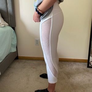 White Lace Lululemon Leggings Size 4 Cropped. These leggings feel slightly tighter than other lulus since the material here is thicker (probably to prevent them from being see-through since they’re white) so they might seem like a size 2. See photos for measurements. There are no stains/rips/tears etc. only worn once :)