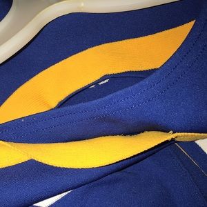 Men’s NBA George McGinnis of the Indiana Pacers jersey. Royal blue with gold & white stripes down the right side only. All graphics are stitched on. Brand & year played label on left hem. Side slits for a smooth fit. This is a pretty heavy jersey & nicely made. A 5 1/4” section of threading has come undone on back neckline (see pics 8&9). Can easily be sewn back together by any good seamstress. Otherwise it’s in immaculate condition. No size listed but looks to fit a 56-58.