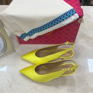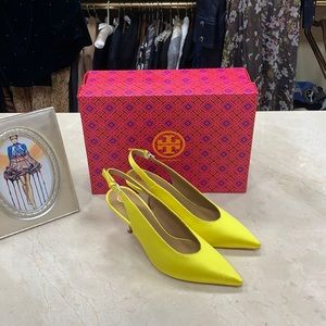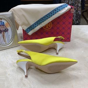 HOST PIC TORY BURCH SATIN SLINGBACK PUMP ACIDIC YELLOW WHITE PATENT HEEL SIZE 8
