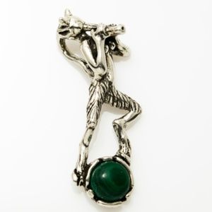 The Sterling Silver Pan Dancer figure cavorts and plays music while standing on a genuine 6 mm Malachite gemstone.