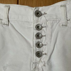 Free People distressed denim cutoffs have polished buttons on the front with frayed hems. 3" inseam. Approximately 8-1/2" front rise; 13" back rise . Button fly. Five-pocket styling.