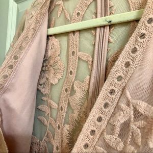 Bohemian inspired embroidered mesh lace romper. Deep V-neckline. Side slits. Back zipper and hook closure. Front + Shorts lining. Closer to peach than pink but website sells as mauve.