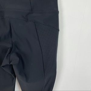 Good condition. Ankle crop fit. Small side slit at hem of pants. Black active leggings. Light wear marks (light spots) on waistband. Stretchy. 2 zippered pockets in the front. Waist 13". Rise 9.5". High-rise. High-waisted. Hip 15". Inseam 26". Nylon, Lycra Spandex.