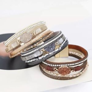 Gray faux leather four strand beaded wrap bracelet with snakeskin print, sparkling druzy stone and rhinestone sparkling detail. Magnetic closure.