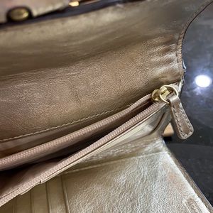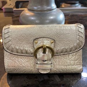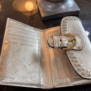 Metallic Coach wallet. Snap to open, outer pocket, 2 inner pockets, zip change purse, 10 credit card slots and a plastic slot for your drivers license.