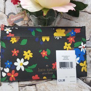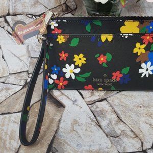(◕‿◕✿) Sailing Medium Double Zip Wristlet Kate Spade Floral Black Yellow Staci