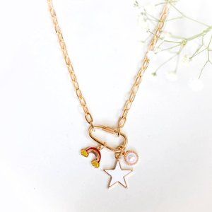 The charms include a large star, a smaller rainbow, and a white circular pendant. All balanced on a trendy keychain-like design on a link chain