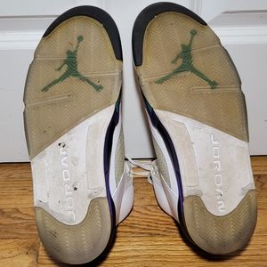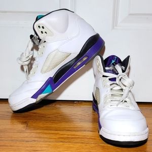 ๐ Pre-owned Nike Air Jordan 5 Retro 'Grape' [2013]. Visible shoe wear, ( ๐ please view all pictures carefullyโ), but still plenty of life left. Original lace locks are included. Shoes will NOT come in their original box but a replacement. Last ๐ท is for reference only.