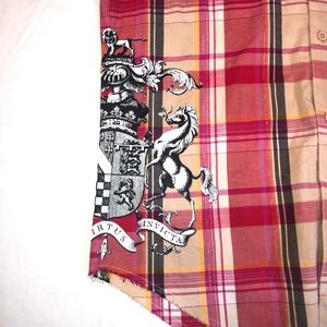 This Bulzeye Black Label Shirt is in great condition. There is an all over plaid pattern. There are several decorative patches and graphics all over the shirt as well. Shirt runs a little smaller than a normal XL. See measurements and pics!