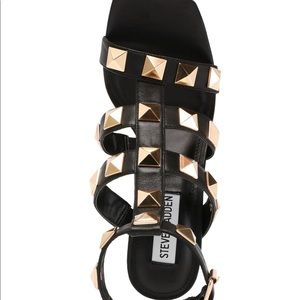 Chunky pyramid studs add bold moto flash to the gladiator-inspired strappy Capri sandals from Steve Madden.