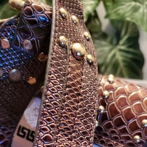 This fabulous vintage bag adds class and sophistication to any womans collection or outfit. The gold studs and accents are definitely an attention grabber. Timmed in brown snakeskin with the same pattern on the bottom. 2 small compartments inside plus a zipper compartment for all your valuables. A must have.