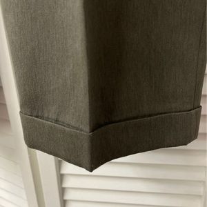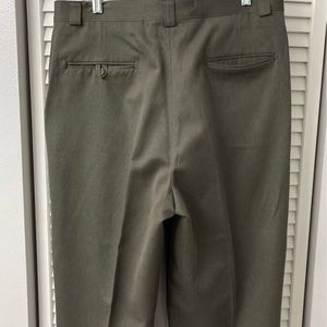 Men’s dress pants in size 34 x 32. Brand is Haggar in 100% polyester with pleated front and cuffed hems. Color is olive green with a soft feel to the material. 2 rear pockets, one is buttoned and the other is not. Pants have only been worn twice and are in excellent condition. Offers welcomed.