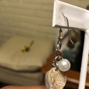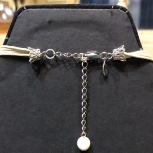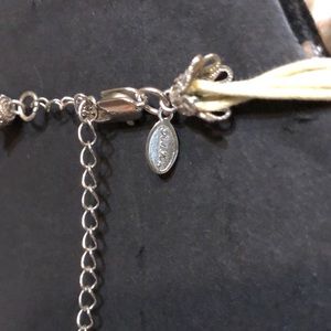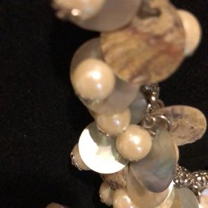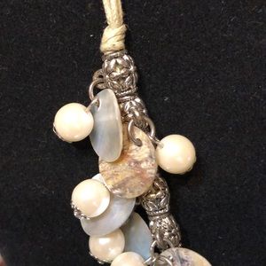 Material is silvertone floral beads and findings, light tanish color rope, pearlescent glass?beads, and Shell with mother of pearl-like backing.