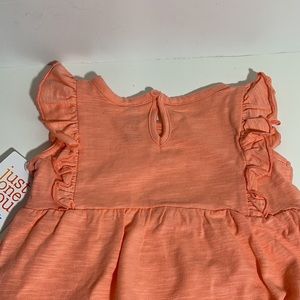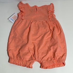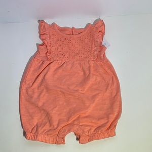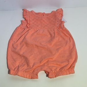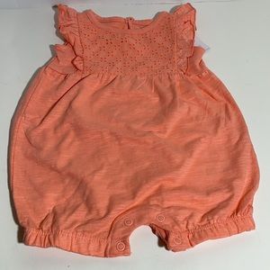 This romper is brand new with tags and has never been worn. This romper is a bright coral color. It is brighter than shown in the pictures. This romper is a size 12 month. It has cap sleeves, snaps at the crotch, eyelet detail and is 100% cotton. Message me with questions!