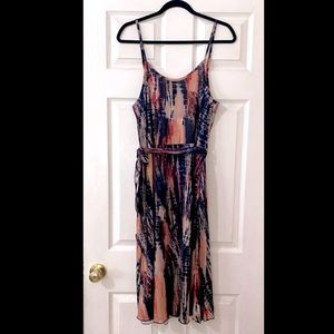 This fun and flirty dress features a figure flattering ribbon tie waist, adjustable camisole straps and a vibrant tie-dye design.