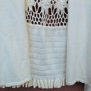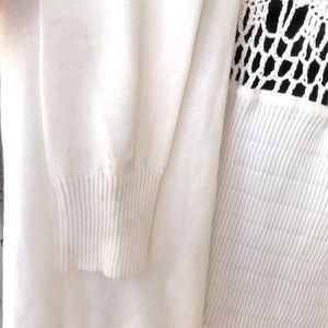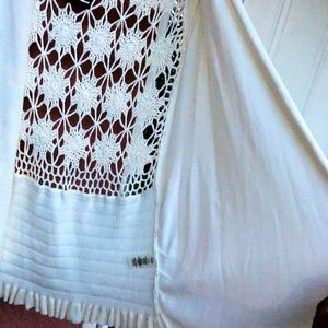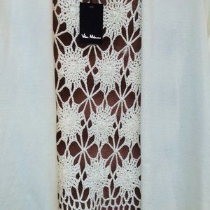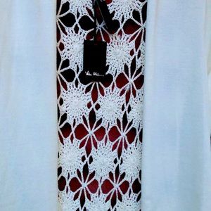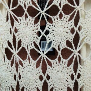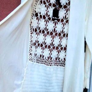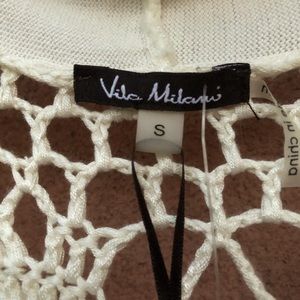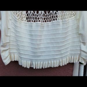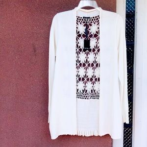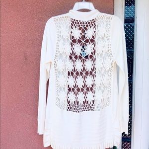 Beautifully designed V/M light weight Cardigan, never warned n in excellent shape. except 4 a small light stain on the in-sleeve (most likely from being in storage, see last pics) this sweater is an eye catcher in a soft eggshell color and peek-a-boo Crochet detailing on back... would pair nicely w/an all black body suit or bathing suit.... you’d look Gr8👍🏽 walking away....