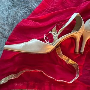 Grace ivory satin wedding shoes in good, used 1x condition. Style is a pointy toe, ankle tie pump. Only flaw is one of the ties needs to be sewn back into shoe.
