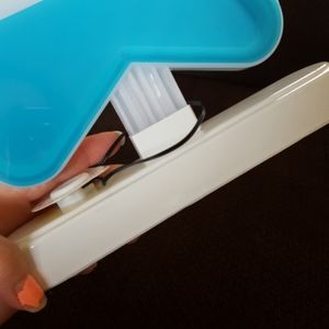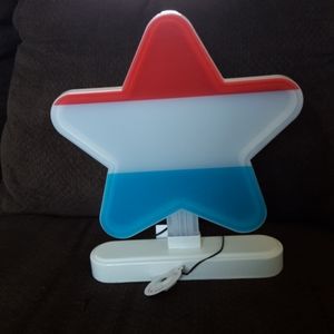 Rope light behind a plastic star. Standing on a white base. Try me button and cord can be taken out. Runs on batteries and has an on/off switch. About 11 inches tall and about 10 inches wide. NWT.