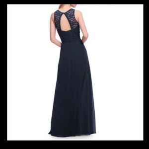 Delicate floral lace bodice and cutout back with a flowing chiffon skirt.