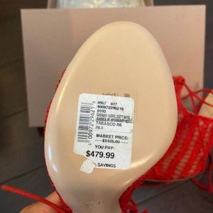 Beautifully made Italian crochet gladiator red heels, tags, never worn. Shoes are lined with nude inserts to protect the crochet. Shoes lace up the ankles to mid calf. Exquisitely made.
