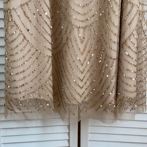 Only worn once, this is a gorgeous floor length (and comfortable!) dress. The color is champagne with gold beads and a size 4. Excellent condition.