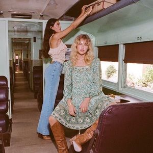 Spell Folk Song tunic in Sage. Size Large. NWOT. Lined. Thinner material than the romper. Feels the same as the house dress & the pieces in the pink colorway. Measurements provided in pics.