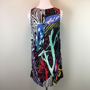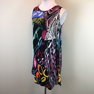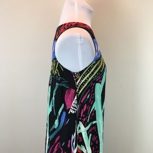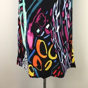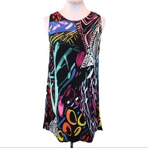 Sleeveless pullover Jackie dress in a multicolor print on a back background. Made in Hawaii, USA.