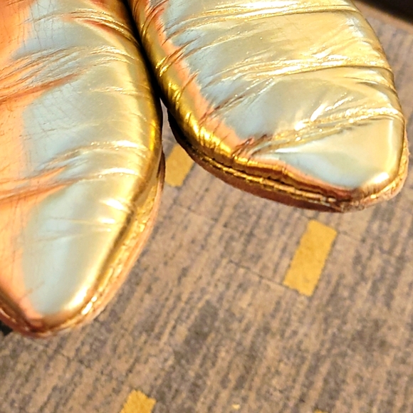 Brilliant gold leather bent into the shape of golden slippers, soft, pliant with a folded down heal, these have a flat leather sole