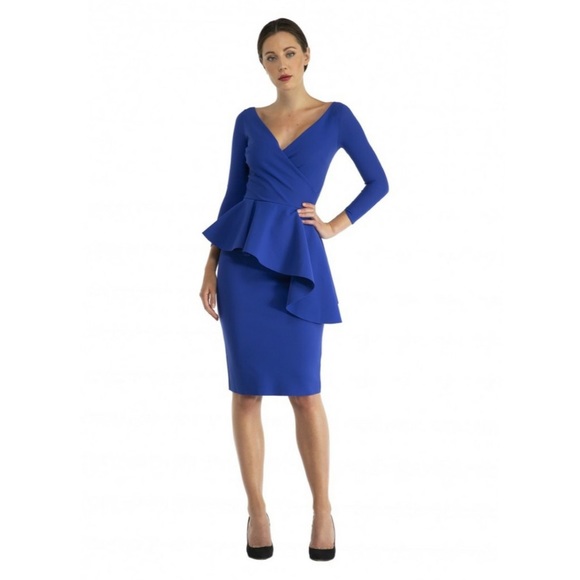 The skirt is pencil shaped with a side asymmetric peplum and falls at the knee