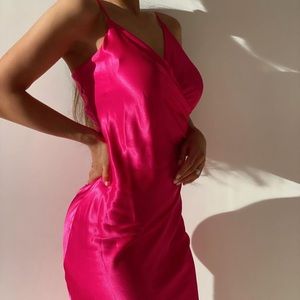 Gorgeous fuchsia pink dress from Zara, satin effect pink dress, pink dress with draped V neckline, bloggers favorite, worn once.
