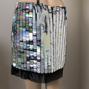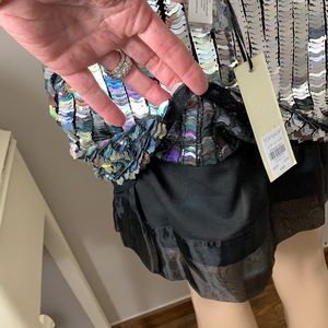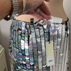 NWT Silver scales with a shimmer of color grace this beautiful mini. Dance the night away! Fully lined with a black sheer lining that drops down 2.5” below silver. Zippered back.
