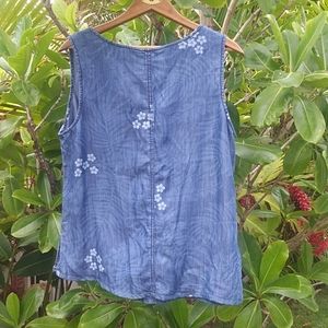 Light denim flowy tank. Pearlescent buttons. Side slits on both sides as shown in picture. Gently used. No flaws, stains or holes.