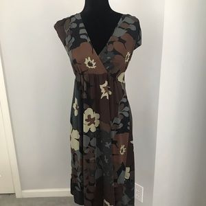Cap sleeve v-neck dress by Jonathan Martin. Camo inspired floral print in brown, tan, black & blue. No stains, rips or holes. Size 14