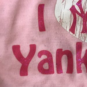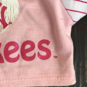 Previously owned pink Yankee tee & plastic helmet . Some signs of being loved .( photographed)