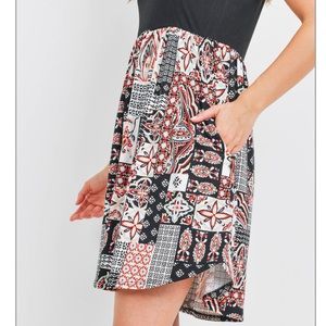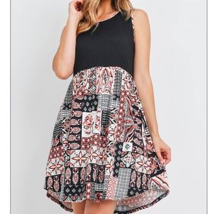 Brand new, super soft dress. Solid black sleeveless stretch top with printed skirt and hem. Fit and flare style dress for a flattering fit. Boho chic. Has pockets. 95% polyester, 5% spandex. Fast shipping. Bundle and save.