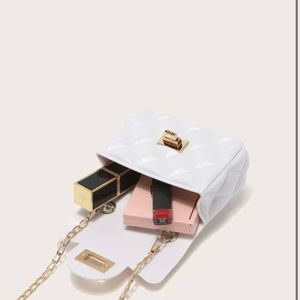 Cute, mini, trendy purse with shiny quilted diamond pattern. Artificial pearls for handle, with long gold detachable chain for cross-body or shoulder strap. Cute addition to any outfit.