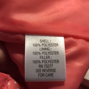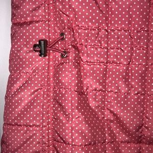 So cute, true pink & white polka-dot, silver buttons up the front, 2 front pockets, has drawstrings in the back for an optional tighter wear. Quilted, puffer design.