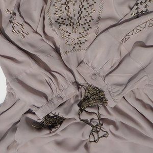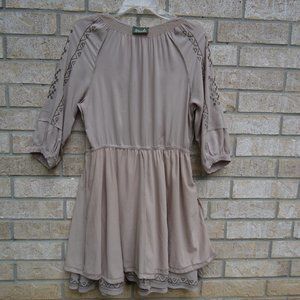 SIZE L. Women's Anthropologie Maeve Embroidered dress for any occasion. Lined. Adjustable drawstring tie waist with tassel. 3/4 sleeves. 3 button front , embroidered detail on sleeves, front and the bottom of the dress. 100 % rayon. Approx measurement: Pit to pit 19.5”. Waist 15”. Hip 18.5”. Length 36”. The raglan sleeves 19.5" long to neck trim. From a smoke-free home. Good pre owned condition. Please zoom in all pictures for details and condition. Item in pictures is the exact item you are purchasing.