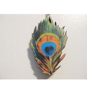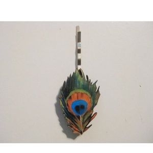 This listing is for a wooden peacock feather bobby pin measuring 1.5" tall x 7/8" wide. The feather topper is mounted on 2" silvertone bobbies.