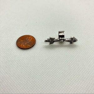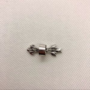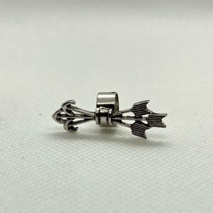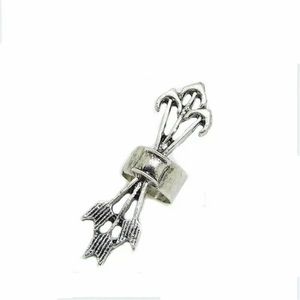 Single earring cuff. Quiver of arrows. Fits in the snug cartilage of the ear. No piercing needed! Silver toned zinc alloy. Fashion jewelry. Measures approx 1.25” in length, shown next to a penny to indicate size. Cuff is adjustable to fit to the ear