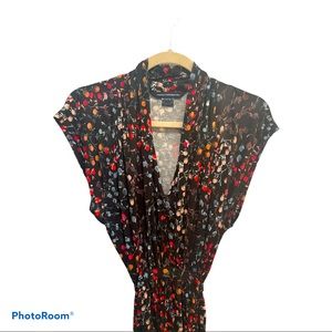Gently worn tie waist dress with colorful pattern. Sleeve opening is wide and comfortable. Length hits above knee depending on height.