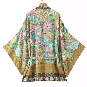 Take your kimono vibes right into any season with this Gorgeous Meadowlands Kimono. This Beautiful piece is inspired by love of all things earthy w/its beautiful pattern and sleeves BUT in a short style. A magical style beautifully crafted with a Western Bohemian flair. You will love this piece! We are obsessed with this one! Layer it over a Dress, Jeans, bikini or a tank and pair of shorts. Perfection in the prettiest of forms!!!